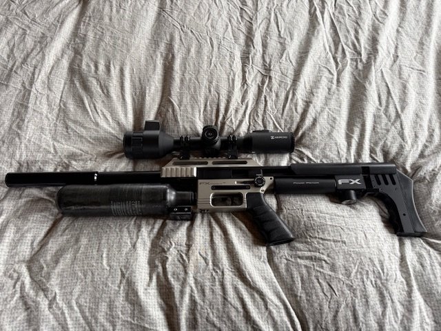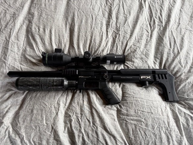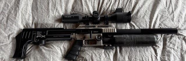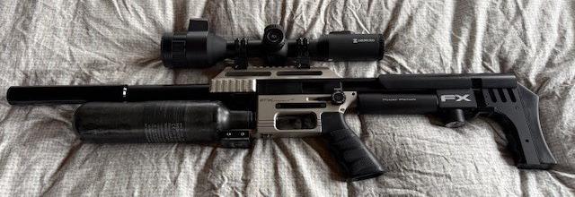 twee wapens fx Impact MK2 compact in 22 en de zwarte is eveneens een FX impact MK2 maar in 25 slugliner 600 mm