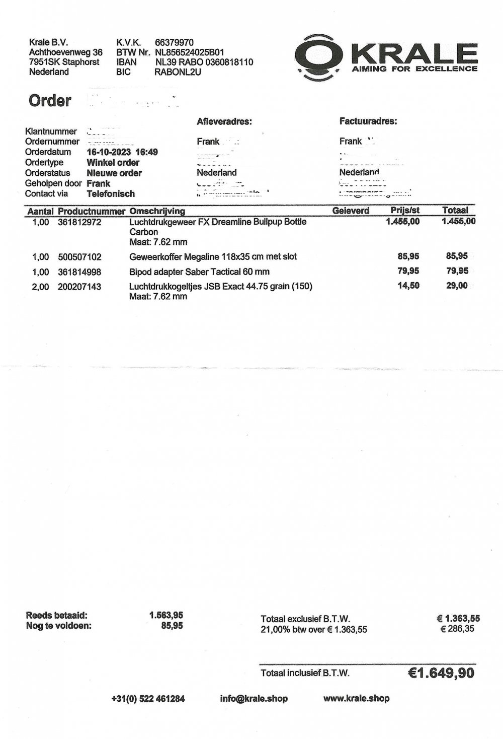 - FX Dreamline Bullpup Carbon .30, nieuwwaarde € 1.455