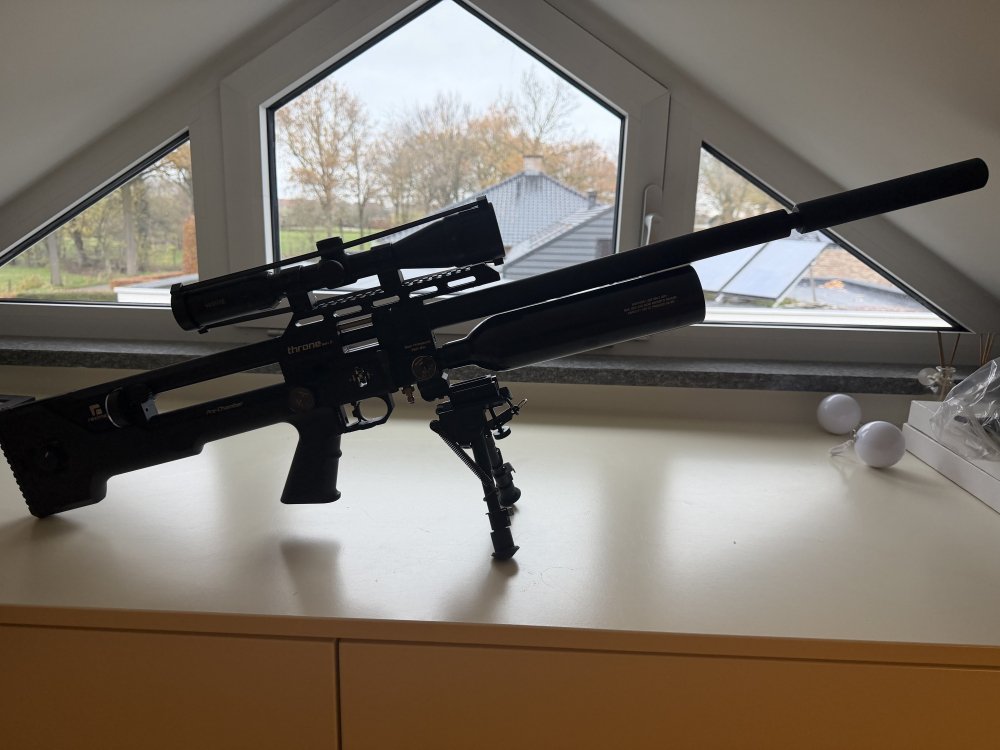Te koop Reximex Throne Gen2 cal25/ 6.35 met Weirach demper en Hawke vantage kijker, vulfles 10 liter, mooie koffer eventueel met statief