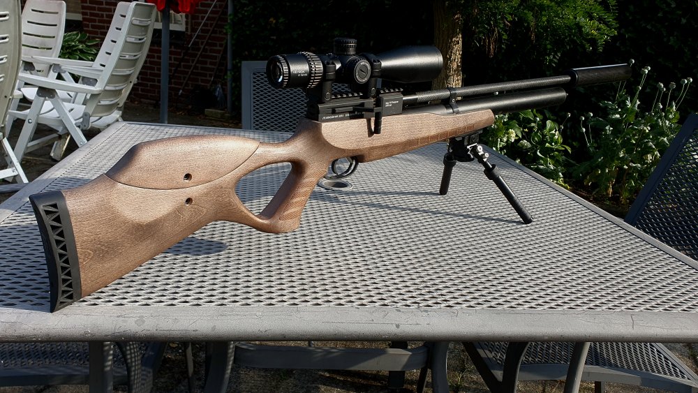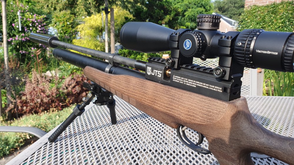 Hele mooie JTS Airacuda max PCP uitgevoerd met een 5.5mm 700mm lange STX Superior liner FX Heavy carbon sleeve